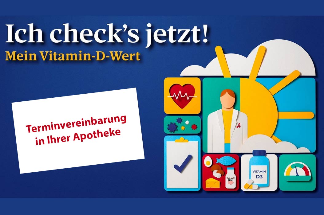 Unter dem Motto „Ich check´s jetzt!“ können Sie Ihren Vitamin-D-Status in Ihrer Apotheke messen lassen. Ein kleiner Stich in die Fingerkuppe genügt, nach 15 Minuten hat man das Resultat.